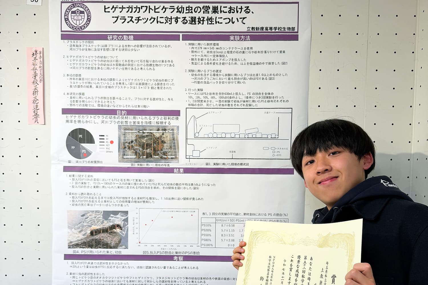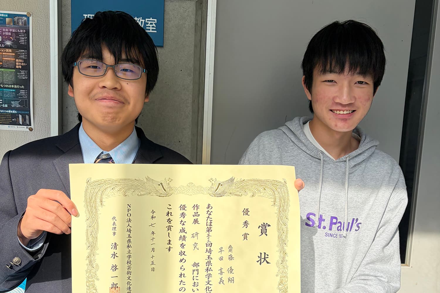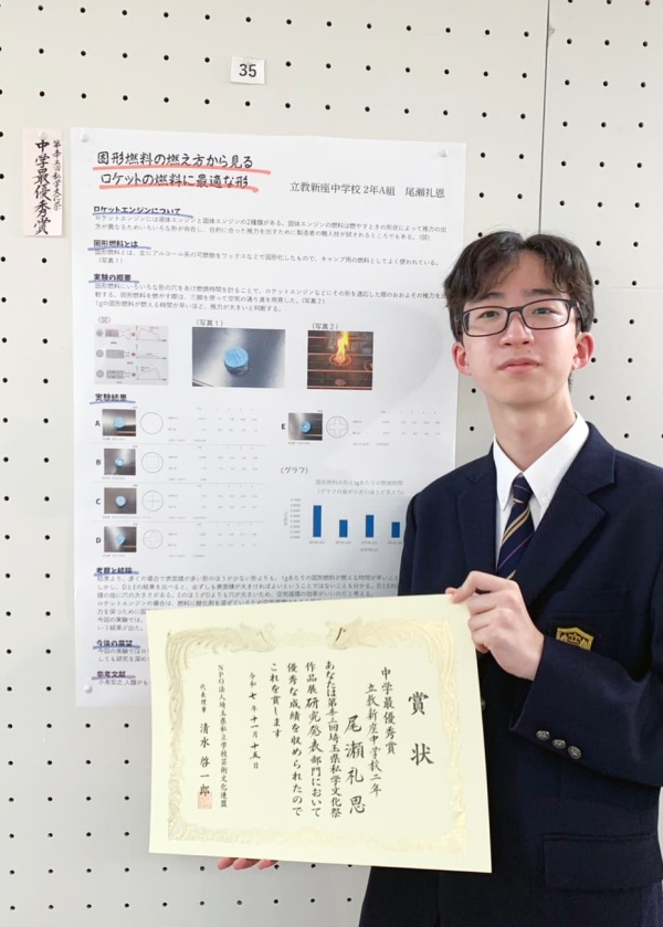 また、中学2年生 金子瑛星さんの自由研究「観察と測定で調べた果物酵素の働き~ゼラチンと鶏むね肉の比較実験~」は、「第76回 埼玉県科学教育振興展覧会/第69回 日本学生科学賞埼玉地区展覧会」で優良賞を受賞しました。