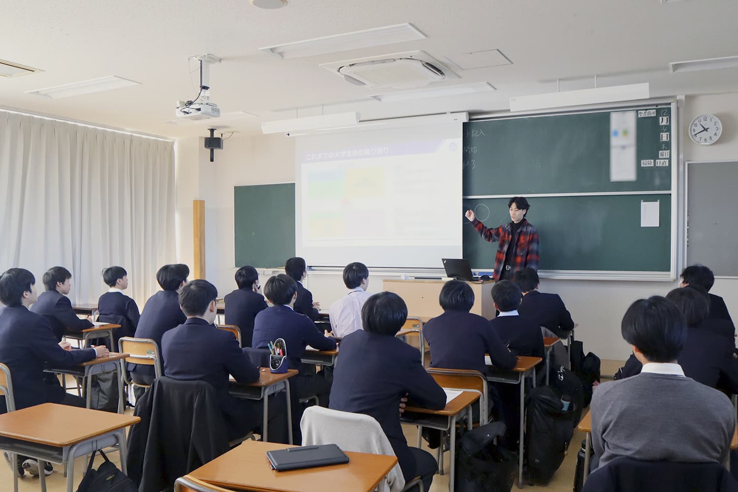 クラスを2グループにわけ、2人の大学生から各20分間、話しを聞きました。